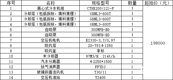 应委托方的要求,河北中废通拍卖有限公司定于2026年01月21日 15:00:00时在河北中废通拍卖有限公司的“聚拍网”在线竞价系统对离心式冷水机组等14项物资进行公开竞价处置(不接受现场竞拍)。联系电话:19253299181