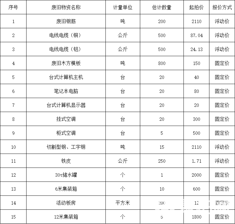 1.2处置内容:废旧钢筋、电线电缆(铜)、电线电缆(铝)、废旧木方模板、台式计算机主机、笔记本电脑、台式计算机显示器、挂式空调、柜式空调、切割型钢、工字钢、铁皮、30t储水罐、6米集装箱、12米集装箱、活动板房。