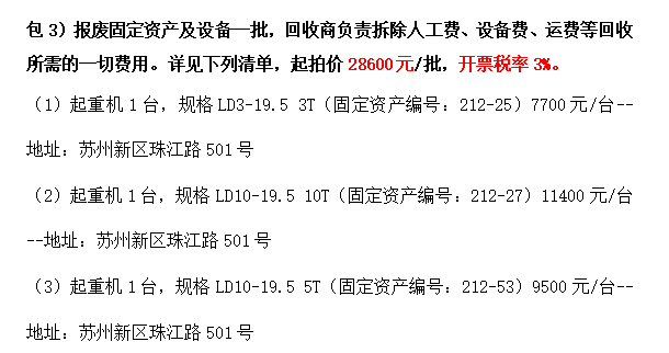 4、报废固定资产及设备一批,回收商负责拆除人工费、设备费、运费等回收所需的一切费用。详见下列清单,起拍价28600元/批,开票税率3%。